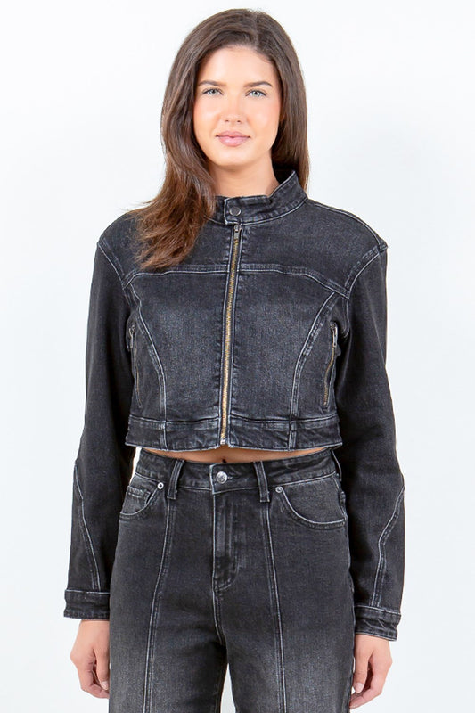 American Bazi Full Size Zip Up Cropped Denim Rider Jacket Plus Size